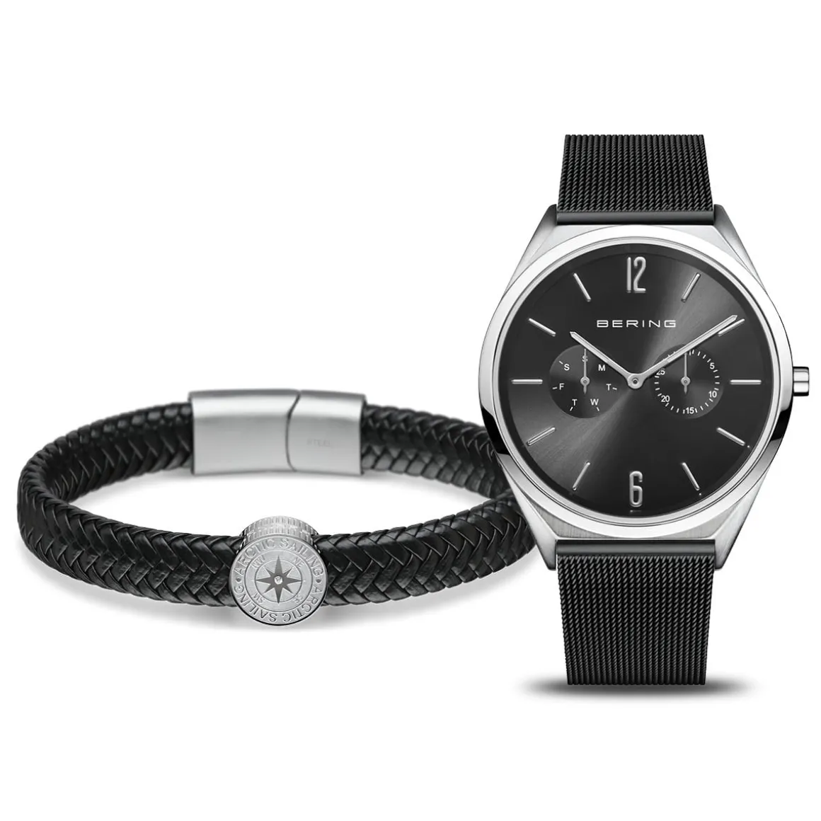 De vaderdagset van dit jaar, bestaande uit ons Ultra Slim-horloge met zwarte Milanaise-band en de bijpassende Arctic Sailing-armband van echt kalfsleer, is een echte blikvanger!