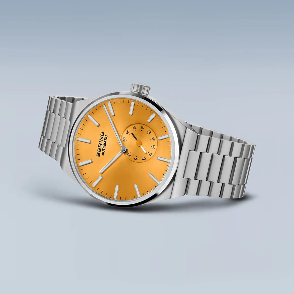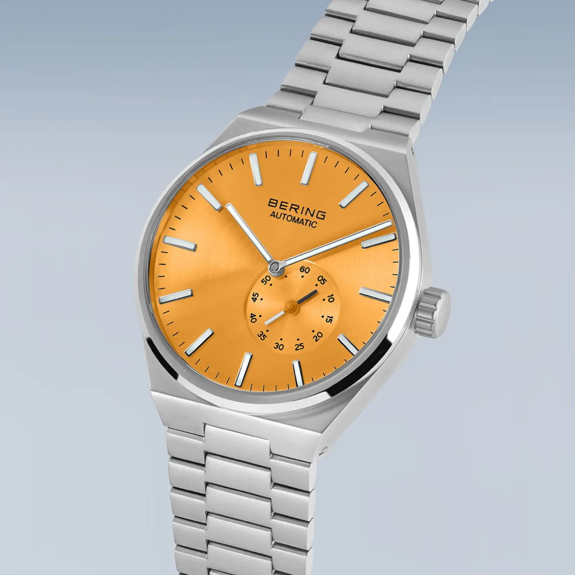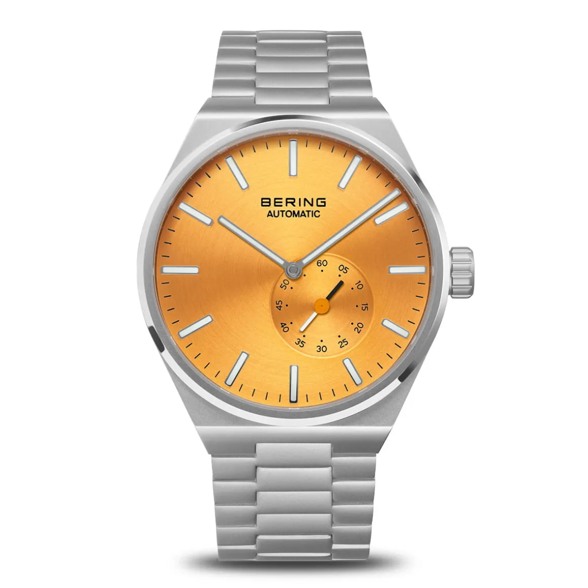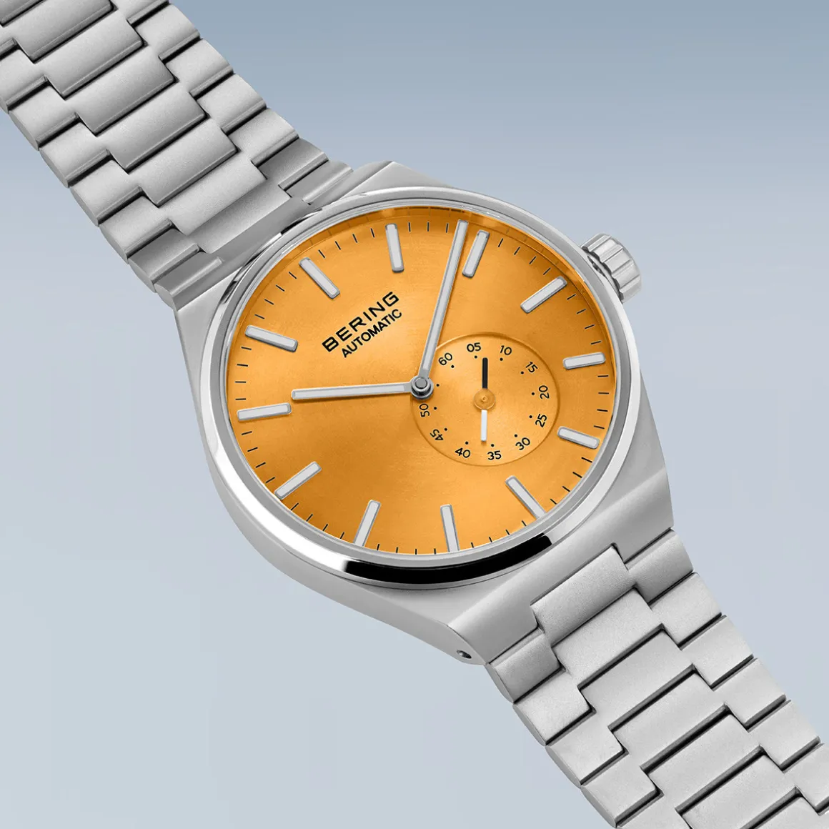 Stel je voor dat je de tijd kunt laten bewegen zoals de golven de zee laten bewegen, door de tijd voort te stuwen met een zachte beweging van je arm en je energie erop over te brengen. Je armbeweging is genoeg en een rotor spant de veer in kleine stapjes op, terwijl de zogenaamde brug – een slipkoppeling – voorkomt dat deze spanveer te ver opwindt. Deze veer is altijd gelijkmatig gespannen en garandeert een soepele werking. Zo’n complex uurwerk neemt normaal gesproken veel ruimte in beslag. Niet zo bij BERING. Het automatische uurwerk maakt een plat ontwerp mogelijk en combineert de typische BERING-kenmerken tot een perfecte, mannelijke symbiose: Deens minimalisme, puristische elegantie en tijdloze schoonheid. Kijkend naar de kleurrijke wijzerplaat roept het herinneringen op aan de kleurrijke gevels van de Scandinavische huizen in Groenland, die schitteren in dezelfde inspirerende diversiteit.